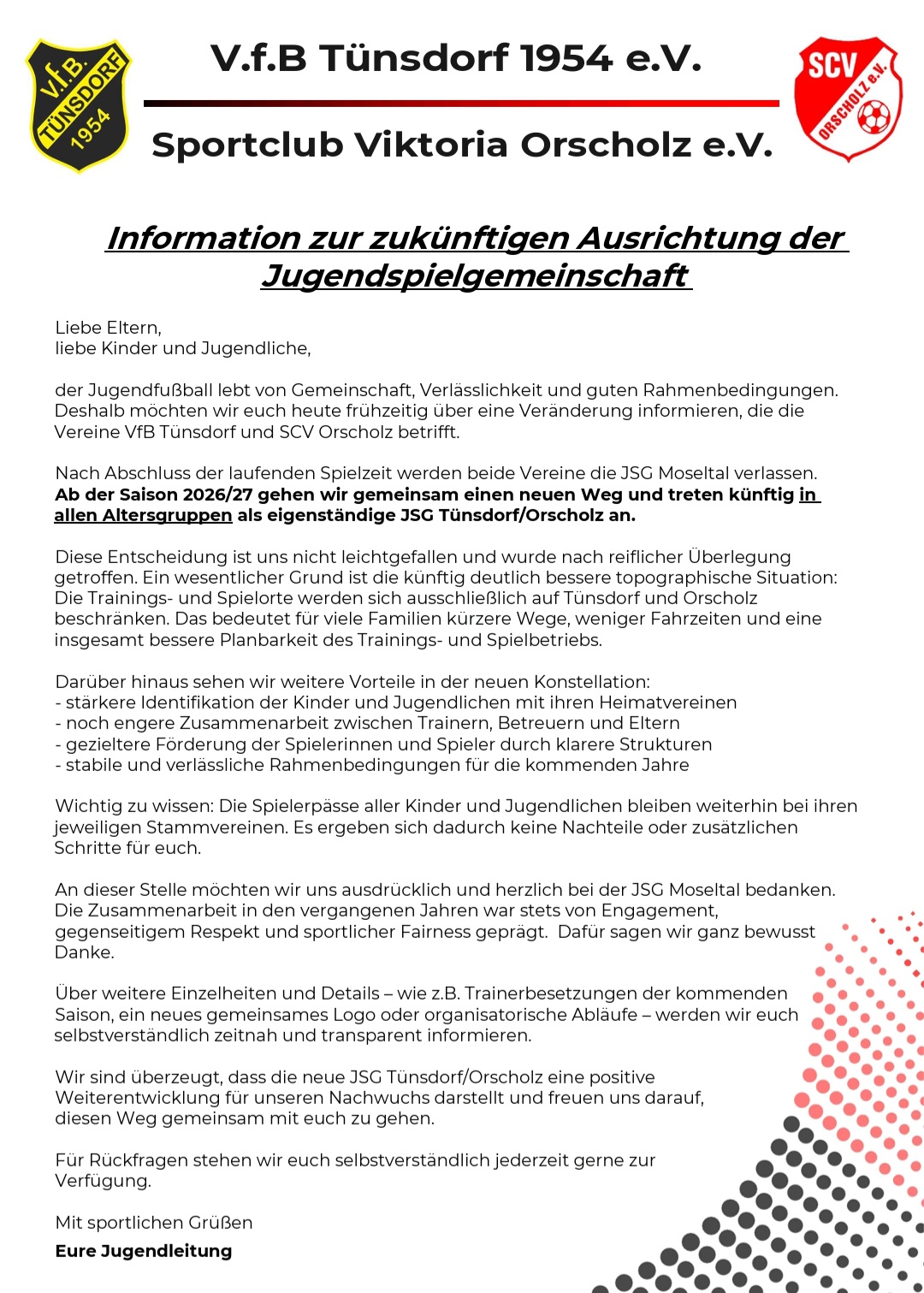 Nach Abschluss der laufenden Spielzeit werden der VfB Tünsdorf und der SCV Orscholz ihre bereits seit mehr als 20 Jahren bestehende JUGEND SG VFB SCV Jugendspielgemeinschaft wieder allein in Angriff nehmen, um alle Jugendmannschaften selbst zu stellen.