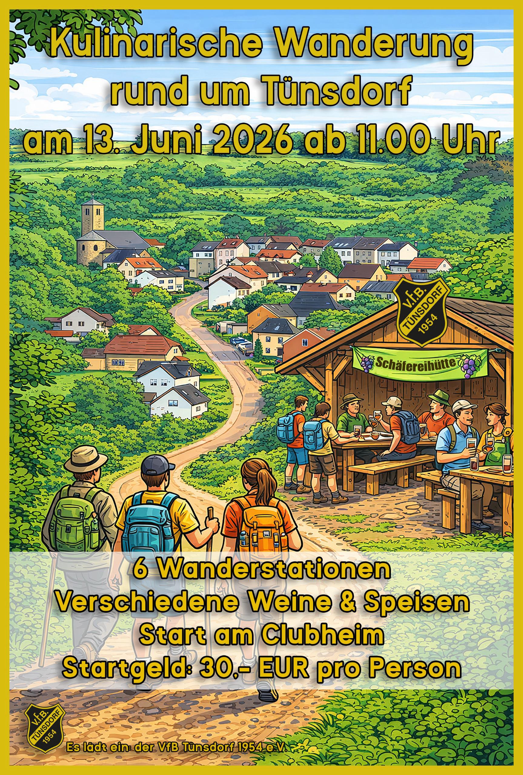 Der VfB Tünsdorf veranstaltet am 13.06.2026 ab 11:00 Uhr die 2. kulinaische Wanderung rund um Tünsdorf.